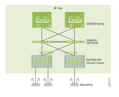 The use case shows how you can deploy a single campus fabric that uses EVPN in the control plane and VXLAN tunnels in the overlay network with Juniper Mist Access Points integration.