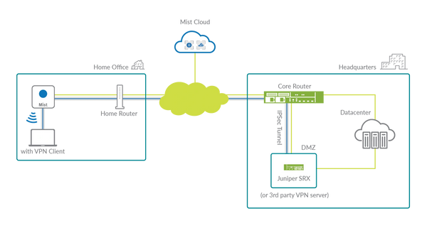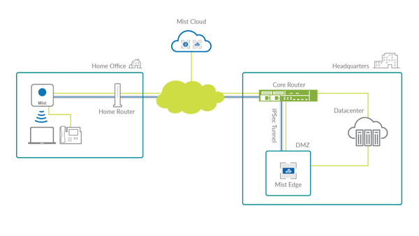 This solution enables you to securely extend your corporate SSID and AAA services to remote offices, while maximizing traffic security with an IPSec tunnel. In addition, this use case is also perfect for managing auxiliary devices in the home, such as a VoIP phone (which can be powered from the auxiliary Ethernet port on the Mist Access Point).