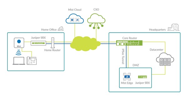 For the telecommuter who has many devices and/or advanced security requirements, the ideal solution is Juniper Connected Security for remote workers. This solution is composed of a Mist Wi-Fi Access Point, Mist Edge, and Juniper SRX security device with Firewall and Advanced Threat Protection (ATP).